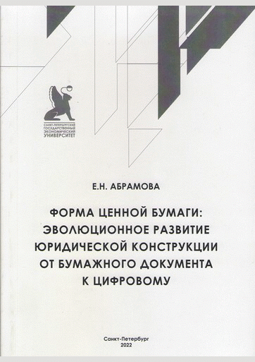 Абрамова, Е.Н. Форма ценной бумаги : эволюционное развитие юридической конструкции от бумажного документа к цифровому / Е. Н. Абрамова; Санкт-Петербургский государственный экономический университет, Кафедра гражданского и корпоративного права. — Санкт-Петербург : Издательство Санкт-Петербургского государственного экономического университета, 2022. — 261 с.. — ISBN 978-5-7310-5665-6.