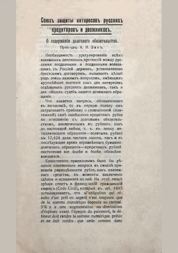 Зак, А.Н. О содержании долгового обязательства / А. Н. Зак; Союз защиты интересов русских кредиторов и должников. — 16 с.. — . Напечатано по старой орфографии.
