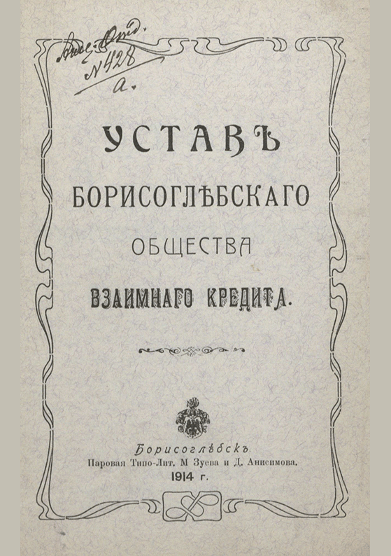 Устав Борисоглебского Общества Взаимного Кредита / Общество Взаимного Кредита. — Борисоглебск : Паровая Типо- Литография М. Зуева и Д. Анисимова, 1914. — 28 с.. — . Напечатано по старой орфографии.