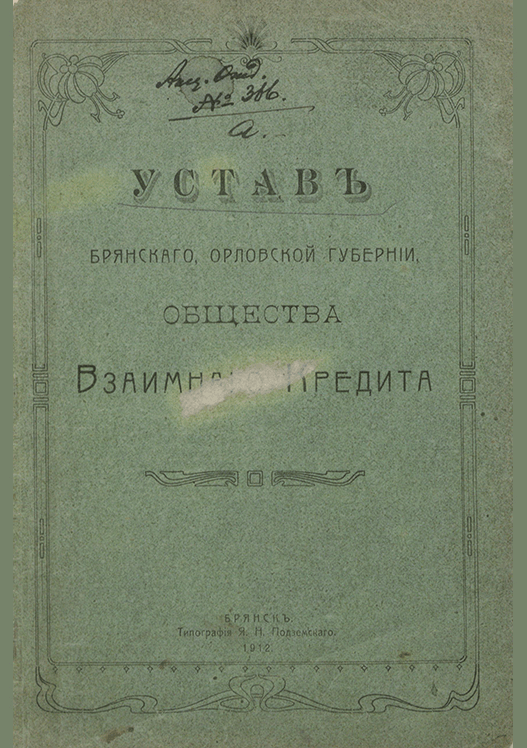 Устав Брянского, Орловской губернии, Общества Взаимного Кредита / Общество Взаимного Кредита. — Брянск : Типография Я.Н. Подземского, 1912. — 28 с.. — . Напечатано по старой орфографии.