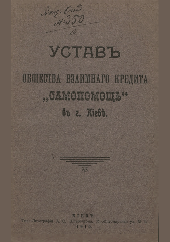 Устав Общества взаимного кредита "Самопомощь" в г. Киеве : утвержден 28 ноября 1909 года / Общество взаимного кредита "Самопомощь". — Киев : Типо-литография А.О. Штерензона, 1910. — 33 с.. — . Напечатано по старой орфографии.