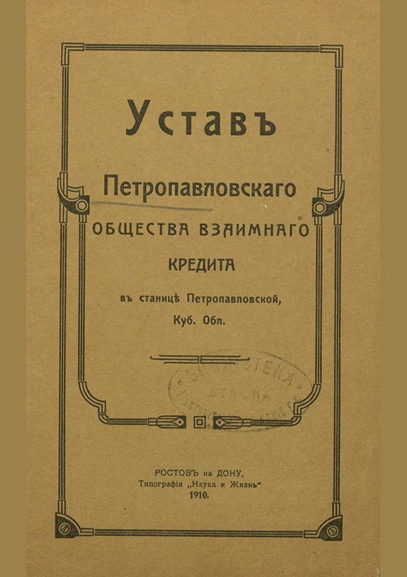 Устав Петропавловского общества взаимного кредита / Петропавловское общество взаимного кредита. — Ростов-на-Дону : Типография "Наука и Жизнь", 1910. — 26 с.. — . Напечатано по старой орфографии. — 10.00 р.
