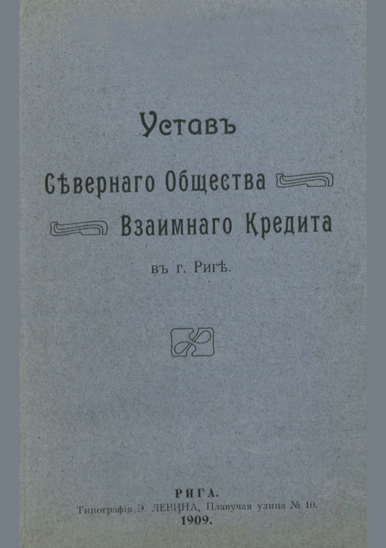 Устав Северного общества взаимного кредита в г. Риге : утвержден 02 августа 1906 года / Северное общество взаимного кредита. — Рига : Типография Э. Левина, 1909. — 40 с.. — . Напечатано по старой орфографии. — 10.00 р.