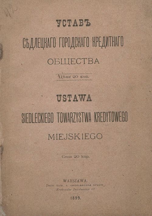 Устав Седлецкого Городского Кредитного Общества, Ustawa Siedleckiego Towarzystwa Kredytowego Miejskiego / Седлецкое Городское Кредитное Общество. — Варшава, 1899. — 92 с.: 1 л. табл.. — . Текст дан на рус. и пол. языках.. — 10.00 р.