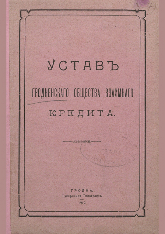 Устав Гродненского Общества Взаимного Кредита / Гродненское Общество Взаимного Кредита. — Гродно : Губернская Типография, 1912. — 36 с.. — . Напечатано по старой орфографии.