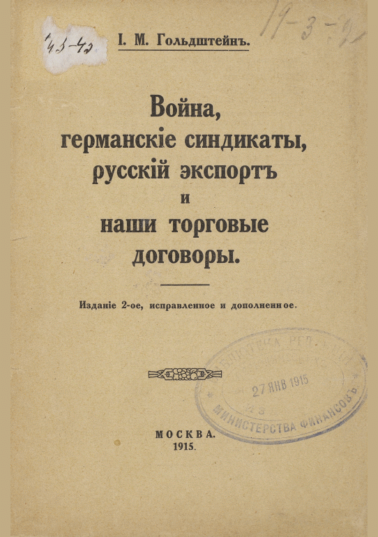 Гольдштейн, И.М. Война, германские синдикаты, русский экспорт и наши торговые договоры / И. М. Гольдштейн. — 2-ое издание, исправленное и дополненное. — Москва, 1915. — 68 с.. — . Напечатано по старой орфографии. — 20.00 р.
