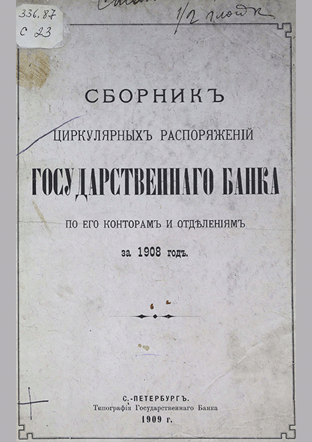 Сборник циркулярных распоряжений Государственного банка по его конторам и отделениям за 1908 год / Государственный банк. — Санкт-Петербург : Типография Государственного банка, 1909. — ХI,191 с.. — . Напечатано по старой орфографии.