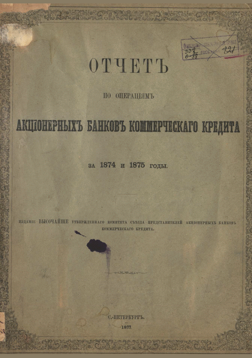 Отчет по операциям за 1874 и 1875 годы / Акционерные Банки Коммерческого Кредита. — Санкт-Петербург : Изд. Ком. Съезда Представителей Акц. Банков Ком. Кредита, 1877. — 410 с.
