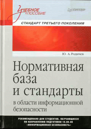 Родичев, Ю.А. Нормативная база и стандарты в области информационной безопасности : учебное пособие для вузов / Ю. А. Родичев. — Санкт-ПетербургМоскваЕкатеринбург : Питер, 2017. — 255 с.: ил.. — (Учебник для вузов). — Библиогр.: с. 240-244. — ISBN 978-5-496-02434-1 : 755.00 р.