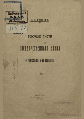 Гандер, К.В. Текущие счета Государственного банка и чековое обращение / К. В. Гандер. — Электрон. текстовые дан.. — Петроград : Тип .ред. период. изд. Мин-ва фин., 1916. — . Напечатано по старой орфографии.
