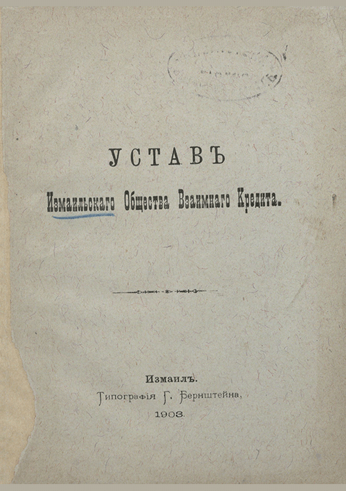 Устав Измаильского Общества Взаимного Кредита : Утв.: 18 Июля 1899 года / Измаильское Общество взаимного кредита. — Измаил : Типография Г. Берштейна, 1903. — 34 с.. — . Напечатано по старой орфографии.