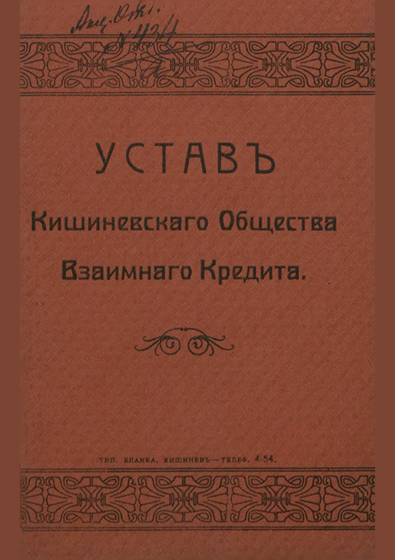 Устав Кишиневского общества взаимного кредита / Кишиневское общество взаимного кредита. — Кишинев : Типография Бланка, Б. г.. — 39 с.. — . Напечатано по старой орфографии.