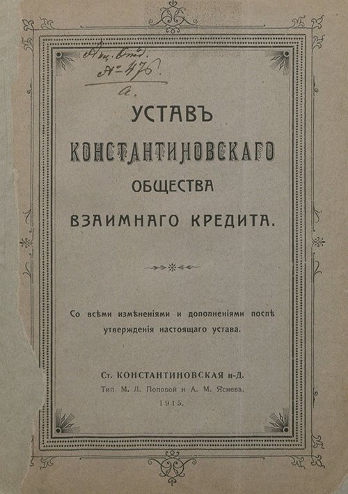 Устав Константиновского общества взаимного кредита : утвержден 27 ноября 1899 года / Константиновское общество взаимного кредита. — Ст. Константиновская н-Д. : Типография М.Д. Поповой и А.М. Яснева, 1915. — 24 с.+ 1л.. — . Напечатано по старой орфографии. — 20.00 р.