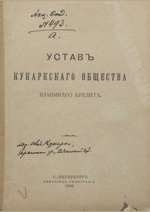 Устав Кукаркского Общества Взаимного Кредита : Утв. 17 декабря 1904 года / Кукаркское Общество взаимного кредита. — Санкт-Петербург : Сенатская типография, 1905. — 36 с.. — . Напечатано по старой орфографии.