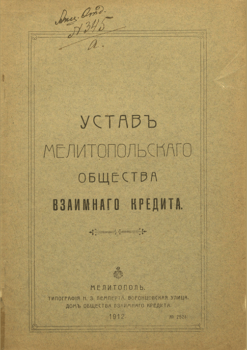 Устав Мелитопольского общества взаимного кредита : утвержден 21 января 1875 года / Мелитопольское общество взаимного кредита. — Мелитополь : Типография Н.З. Лемперта, 1912. — 32 с.. — . Напечатано по старой орфографии. — 20.00 р.