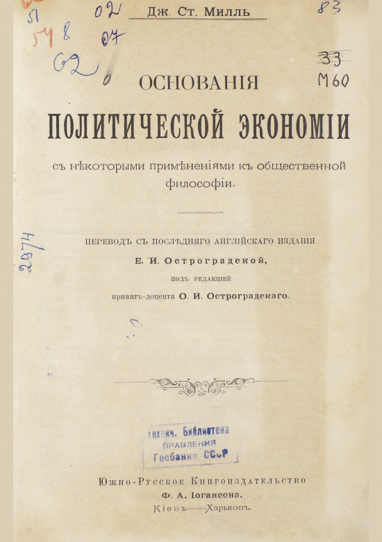 Милль, Д.С. Основания политической экономии с некоторыми применениями к общественной философии / Д. С. Милль; перевод с английского Е. И. Остроградская; редактор О. И. Остроградский. — КиевХарьков : Южно-Русское Книгоиздательство Ф.А. Йогансона, 1897. — 866, XVII с.. — . Напечатано по старой орфографии. — (в пер.) : 30.00 р.
