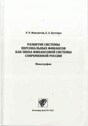 Мавлютов, Р.Р. Развитие системы персональных финансов как звена финансовой системы современной России / Р. Р. Мавлютов, Е. А. Бутенко; Волгоградский государственный технический университет. — Волгоград : ВолгГТУ, 2017. — 126 с.: табл., граф.. — Библиогр.: с. 109-115. — ISBN 978-5-9948-2524-2.