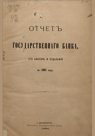 Отчет Государственного банка, его контор и отделений за 1893 год. — Санкт-Петербург : Типография Государственного банка, 1894. — 88 с.+ 10табл.. — . Напечатано по старой орфографии.. Содержание : Отчет по ликвидации бывшего Польского банка за 1893 год ; Отчет по ликвидации Александринского Тульского банка за 1893.