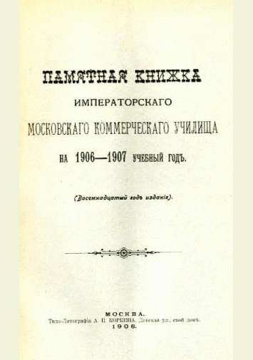 Памятная книжка Императорского Московского Коммерческого Училища на 1906-1907 учебный год. Восемнадцатый год издания / Императорское Московское Коммерческое Училище. — Москва : Типо-Литография А.П. Коркина, 1906. — 128 с.. — . Напечатано по старой орфографии. — 1251.00 р.