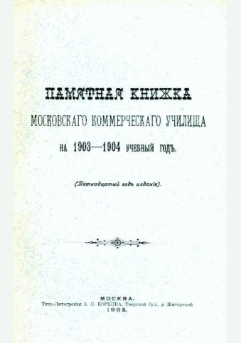 Памятная книжка Московского Коммерческого Училища на 1903-1904 учебный год. Пятнадцатый год издания / Московское Коммерческое Училище. — Москва : Типо-Литография А.П. Коркина, 1903. — 191 с.. — . Напечатано по старой орфографии. — 1251.00 р.