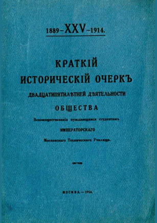 Краткий исторический очерк двадцатипятилетней деятельности Общества вспомоществования нуждающимся студентам Императорского Московского Технического Училища. 1889-XXV-1914 / Императорское Московское Техническое Училище. — Москва : Типо-литография Русского товарищества Печатного и Издательского дела, 1914. — 124 с.: вкл. л., ил.. — . Напечатано по старой орфографии. — 1251.00 р.