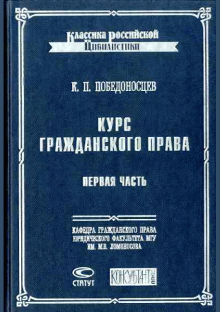 Победоносцев, К.П. Курс гражданского права. Ч. 1. Вотчинные права : в 3-х ч. / К. П. Победоносцев. — 2004. — 800 с.. — . Есть издание 1896 г. в электронном виде. Шифр издания: ЭР/669.. — ISBN 5-8354-0128-0 : 460.00 р.