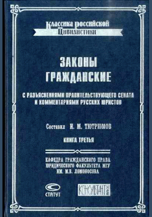 Законы Гражданские. Кн. 3 : (Свод зак. т. X, ч. 1, изд. 1900 г. по Прод. 1906 и 1908 гг.): с разъяснениями Правительствующего Сената (Гражд. Кассац., 1 и 2 Департаментов, Первого Общ. Собр. и Общ. Собр. 1, 2 и Кассац. Департ. по 1 сентября 1910 г.) и комментариями русских юристов, извлеч. из науч. и практ. тр. по гражд. праву и судопроизводству (по 1 июля 1910 г.): в 5-ти кн. / сост. И. М. Тютрюмов. — 2004. — 572 с.. — ISBN 5-8354-0194-9 : 427.00 р.