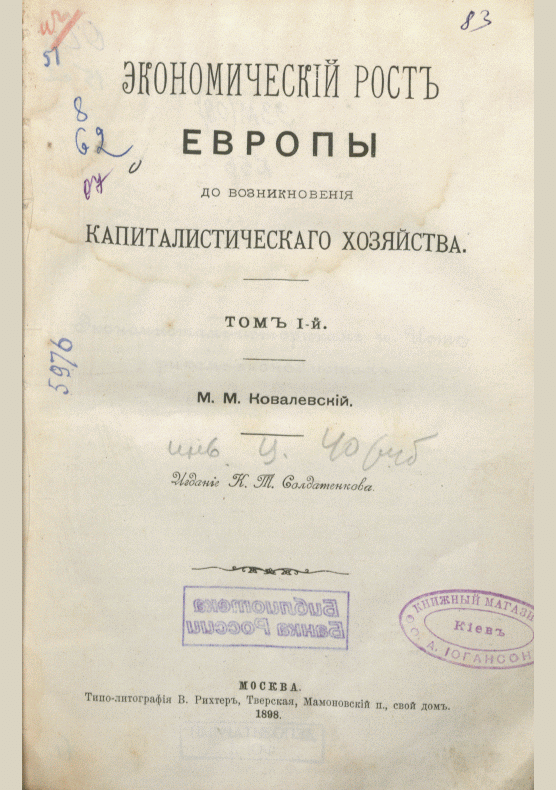 Ковалевский, М.М. Экономический рост Европы до возникновения капиталистического хозяйства. Т. 1 / М. М. Ковалевский. — Москва : Изд. К.Т. Солдатенкова, 1898. — ХХХІІ, 712 с.. — . Напечатано по старой орфографии. — (в пер.) : 40.00 р.