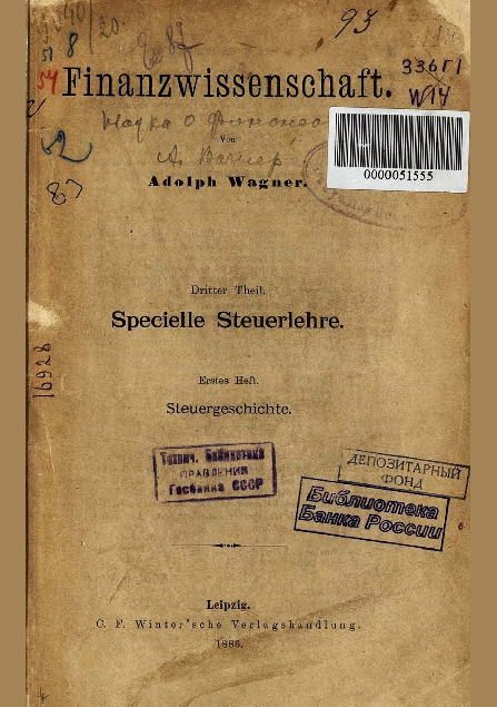 Wagner, A. Finanzwissenschaft. Dritter Theil. Specielle Steuerlehre. Steuergeschichte / A. Wagner. — Прижизн. изд.. — Leipzig : C.F. Winter'sche Verlagshandlung, 1886. — 302 S.