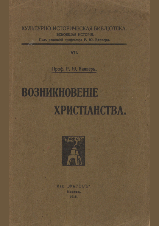 Виппер, Р.Ю. Возникновение христианства / Р. Ю. Виппер. — Москва : Фарос, 1918. — 118 с.. — (Культурно-историческая библиотека). — . Напечатано по старой орфографии. — 25.00 р.