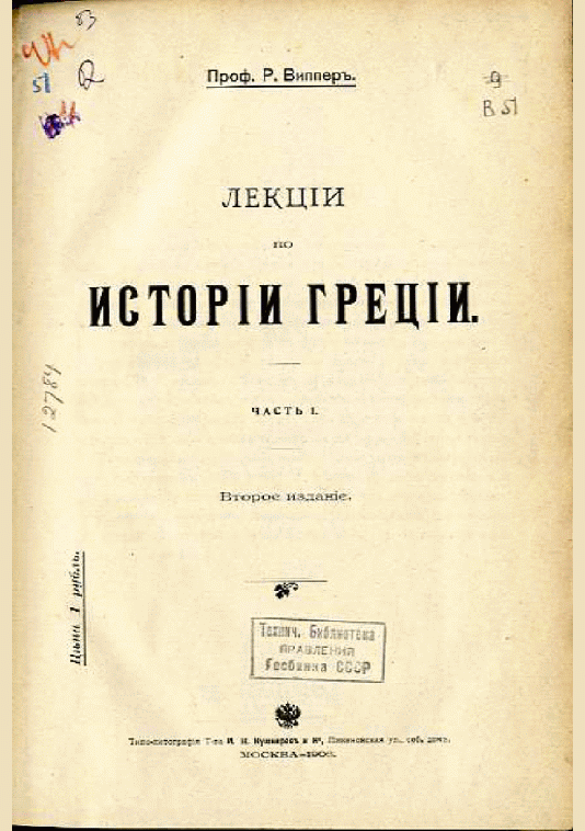 Виппер, Р. Лекции по истории Греции. Ч. I / Р. Виппер. — 2-е изд.. — Москва : Типо-литография Т-ва И.Н. Кушнерев и К°, 1906. — 230 с.: карты. — (в пер.) : 53.00 р.