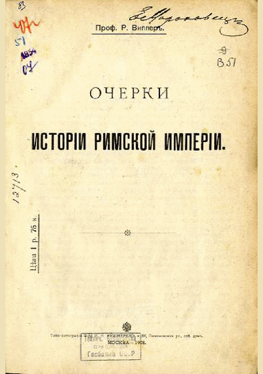 Виппер, Р. Очерки истории Римской империи / Р. Виппер. — Москва : Типо-литография Т-ва И.Н. Кушнерев и К°, 1908. — 406 с.. — . Напечатано по старой орфографии. — (в пер.) : 50.00 р.