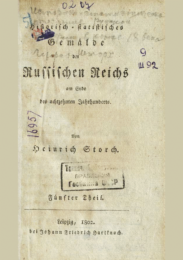 - 5. Storch, H. Historisch-statistisches Gemälde des Russischen Reichs am Ende des achtzehnten Jahrhunderts / H. Storch. — Прижизн. изд.. — Leipzig : Johann Friedrich Hartknoch, 1799. — XX, 504 S.