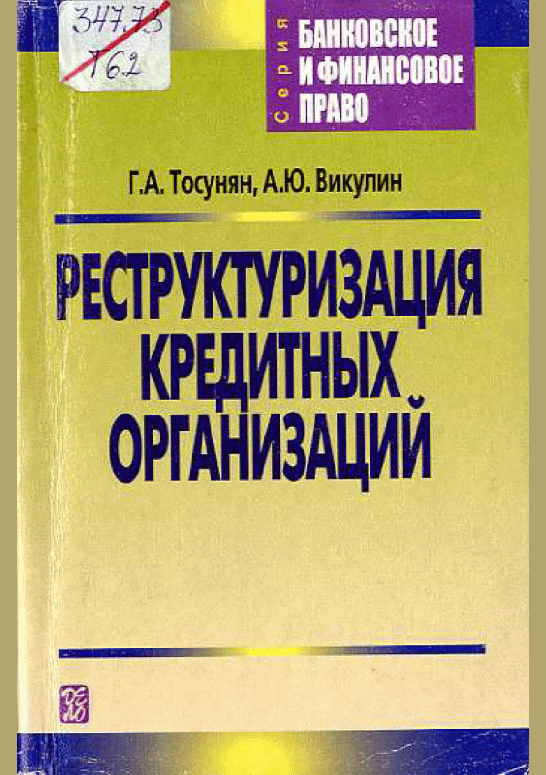 Тосунян, Г.А. Реструктуризация кредитных организаций / Г.А. Тосунян, А.Ю. Викулин. — Москва : Дело, 2002. — 352 с.. — (Банковское и финансовое право). — ISBN 5-7749-0255-2 : 178.20 р.