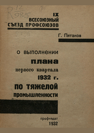 Пятаков, Г. О выполнении плана первого квартала 1932 г. по тяжелой промышленности / Г. Пятаков; IX Всесоюзный съезд профсоюзов. — Москва : Профиздат, 1932. — 64 с.