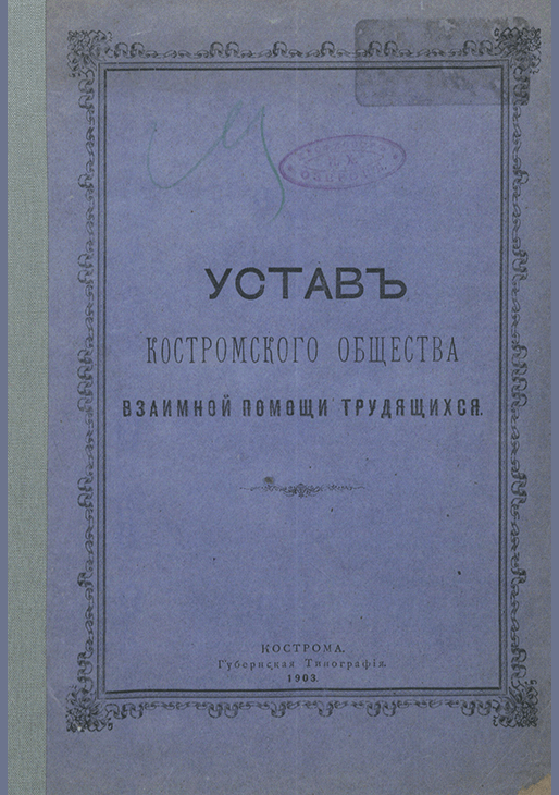 Устав Костромского общества взаимной помощи трудящихся / Костромское общество взаимной помощи трудящихся. — Кострома : Губернская Типография, 1903. — 20 с.. — . Напечатано по старой орфографии.