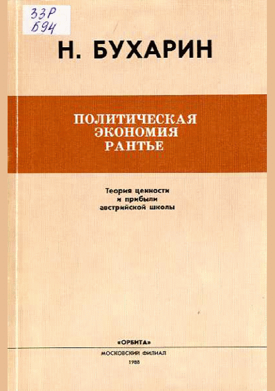 Бухарин, Н.И. Политическая экономия рантье : Теория ценности и прибыли австр. шк. / Н.И. Бухарин. — Репринтное воспроизведение изд. 1925 г.. — Москва : Орбита, 1988. — 191 с.. — 1.90 р.