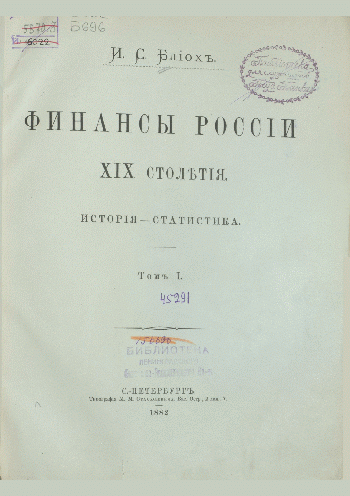 Блиох, И.С. Финансы России ХIХ столетия. Т. 1 : история - статистика / И. С. Блиох. — Санкт-Петербург : Типография М.М. Стасюлевича, 1882. — 292 с.+ 4л. табл.. — . Напечатано по старой орфографии.. Алф. указ.