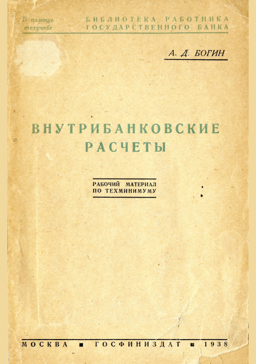 Богин, А.Д. Внутрибанковские расчеты : рабочий материал по техминимуму / А. Д. Богин; редакторы: Г. А. Зыбин, В. В. Щелоков. — Москва : Госфиниздат, 1938. — 48 с.: обр., табл.. — (Библиотека работника Государственного Банка). — 10000.