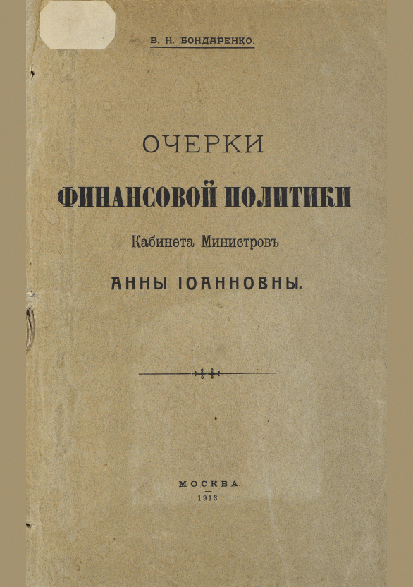 Бондаренко, В.Н. Очерки финансовой политики Кабинета Министров Анны Иоанновны / В.Н. Бондаренко. — Москва : Печатня А. Снегиревой, 1913. — VIII, 390 с.+ XVIс. прил.. — . Напечатано по старой орфографии.