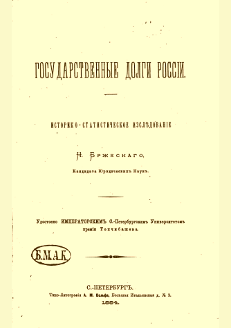 Бржеский, Н.К. Государственные долги России : историко-статистическое исследование / Н.О. Бржеский. — Санкт-Петербург : Типо-Литография А.М. Вольфа, 1884. — 329 с.. — . Напечатано по старой орфографии. — 3.00 р.