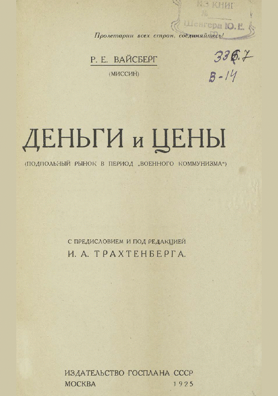 Вайсберг, Р.Е. Деньги и цены : подпольный рынок в период "Военного коммунизма" / Р. Е. Вайсберг; ред. И. А. Трахтенберг. — Москва : Изд. Госплана СССР, 1925. — 159 с.. — 0.50 р.