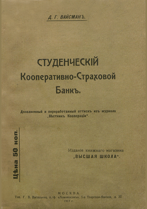 Вайсман, Д.Г. Студенческий кооперативно-страховой банк / Д. Г. Вайсман. — Доп. и перераб. оттиск из журнала "Вестник кооперации". — Москва : Высшая школа, 1917. — 32 с.