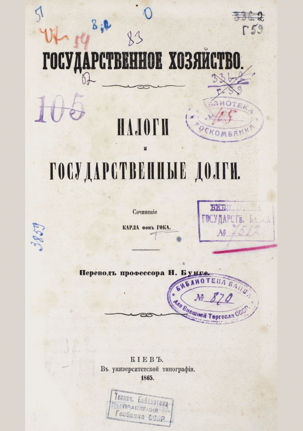 Гок, К.фон Налоги и государственные долги / К. фон Гок. — Киев, 1865. — 324 с.. — (Государственное хозяйство).