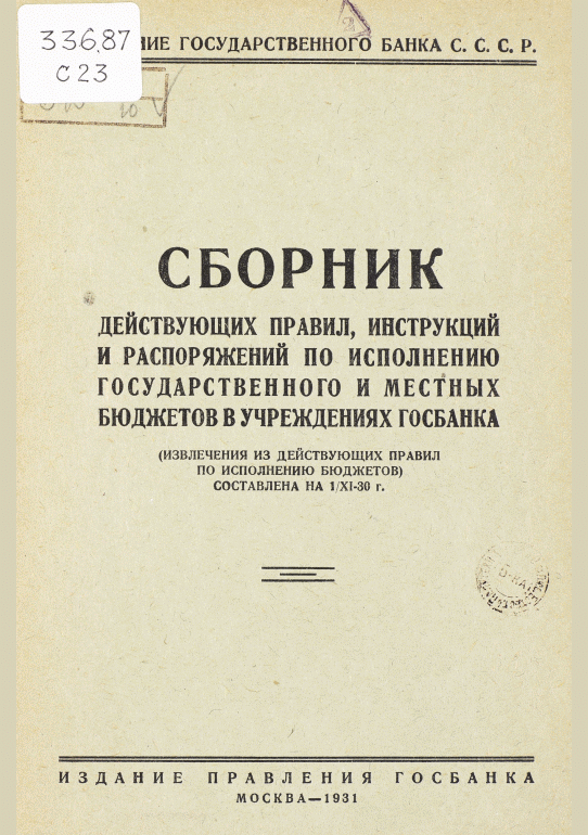 Сборник действующих правил, инструкций и распоряжений по исполнению государственного и местных бюджетов в учреждениях Госбанка : сост. на 1/XI-30 г. (Извлечения из действующих правил по исполнению бюджетов) / Государственный банк СССР, Правление. — Москва : Издание Правления Госбанка, 1931. — 46 с.