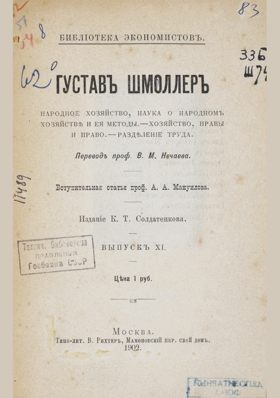 Шмоллер, Г. Народное хозяйство, наука о народном хозяйстве и ее методы. — Москва : Изд. К.Т. Солдатенкова, 1902. — 368 с.: портр. — (Библиотека экономистов; Вып. XI). — . Напечатано по старой орфографии.