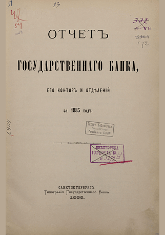 Отчет Государственного банка, его контор и отделений за 1885 год. — Санкт-Петербург : Типография Государственного банка, 1886. — 82 с.: вкл. л., табл.. — . Напечатано по старой орфографии.