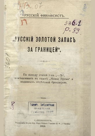 Русский золотой запас за границей : по поводу статей г-на "-Ъ", помещенных в газете "Новое Время" и изданных отдельной брошюрою. — Санкт-Петербург : Типография Штаба Отд. Корп. Погран. Стражи, 1913. — 90 с.. — (Русский финансист). — . Напечатано по старой орфографии.