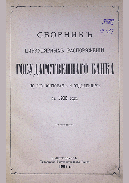 Сборник циркулярных распоряжений Государственного банка по его конторам и отделениям за 1905 год / Государственный банк. — Санкт-Петербург : Типография Государственного банка, 1906. — 286 с.. — . Напечатано по старой орфографии.