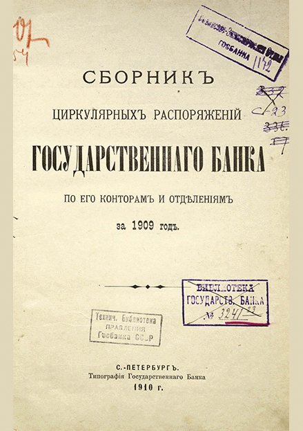 Сборник циркулярных распоряжений Государственного банка по его конторам и отделениям за 1909 г. / Государственный банк. — Санкт-Петербург : Типография Государственного банка, 1910. — 261 с.. — . Напечатано по старой орфографии.